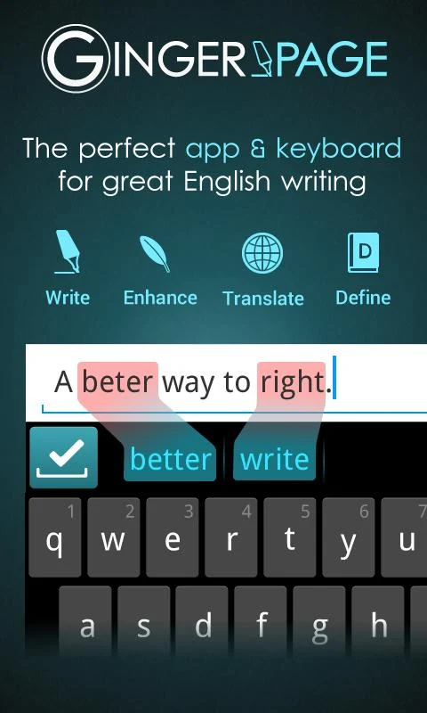Escreva, corrija e melhore sua escrita com o Ginger Page & Grammar Keyboard, o mais avançado aplicativo de redação em inglês para Android – agora totalmente GRÁTIS para baixar e usar!