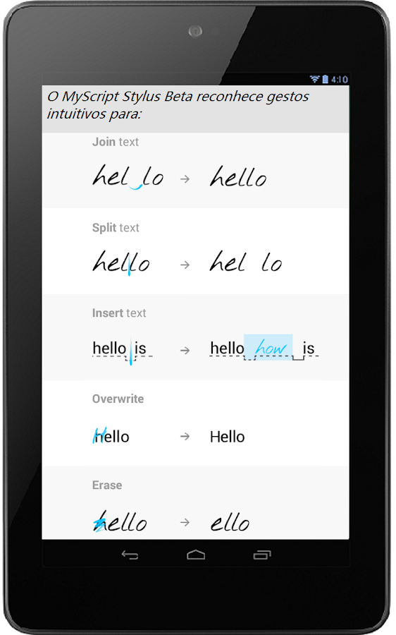 - O MyScript® Stylus™ Beta reconhece gestos intuitivos para: