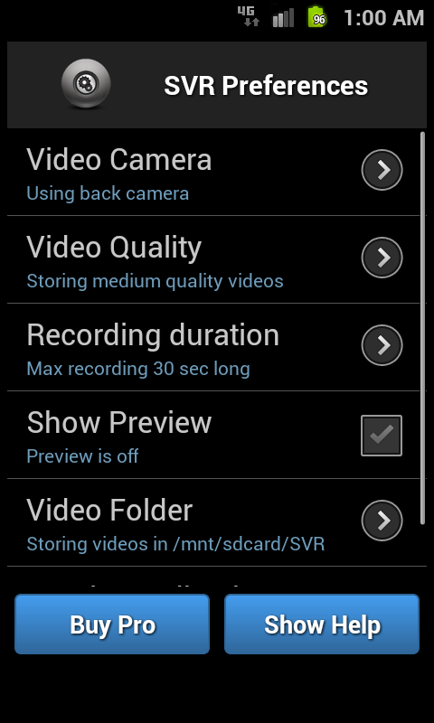 • Opção para gravar o vídeo sem áudio. Isto é para os usuários que utilizam o aplicativo como um Cam traço para seu carro. Isto permite usar aplicações de voz ativado durante a gravação de vídeo