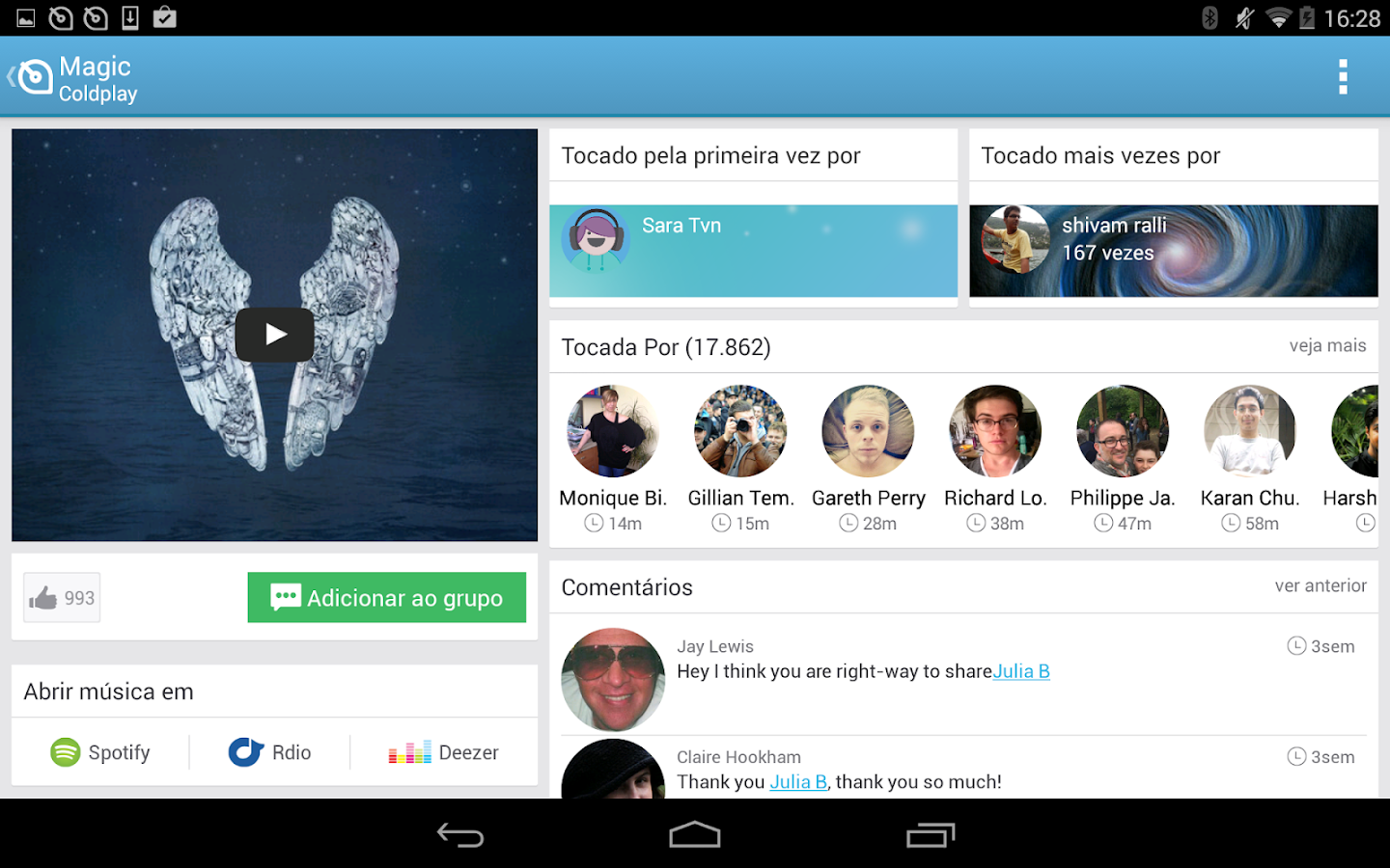 Crie grupos privados para conversar e compartilhar sua música com os amigos e seguidores. Deslize para a esquerda e veja todas as músicas que foram compartilhados anteriormente no grupo. Envie a lista compartilhada de músicas para o Spotify com o toque de um botão. Convide seus amigos do Twitter, Facebook e muito mais.